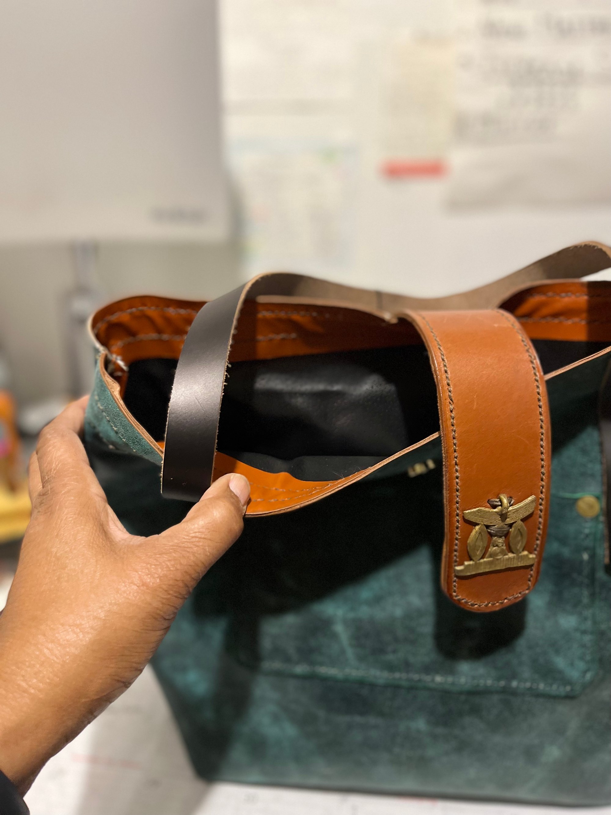 Dark blue and Pink full grain leather tote bag. Brass Adinkra symbol and rivets. Partial lining. Hand sewn. Approximately 16x13x5 1/2