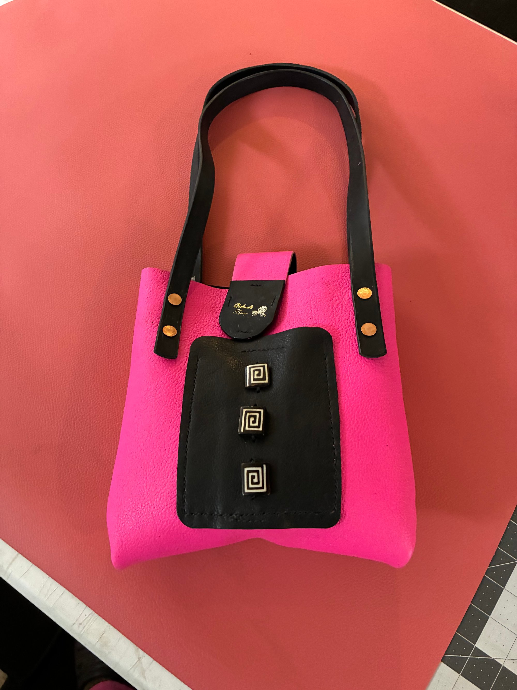 13 wide 9 height , one outside pocket, no lining. Straps are brown. Copper rivets.